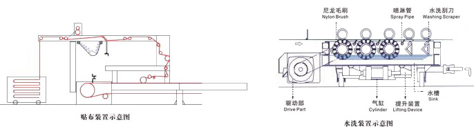 導帶清洗直接關系到印花質量,本機水洗裝置由3根尼龍毛刷,3根噴淋管及2根刮刀等組成,整個裝置為氣動結構,使導帶能達到最好的清洗效果。
